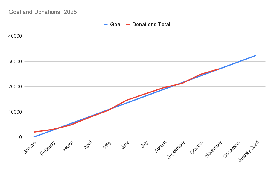 After a brief uptick in September, donations unfortunately dipped in October, putting the donation goal on the razor's edge and a downward trend: