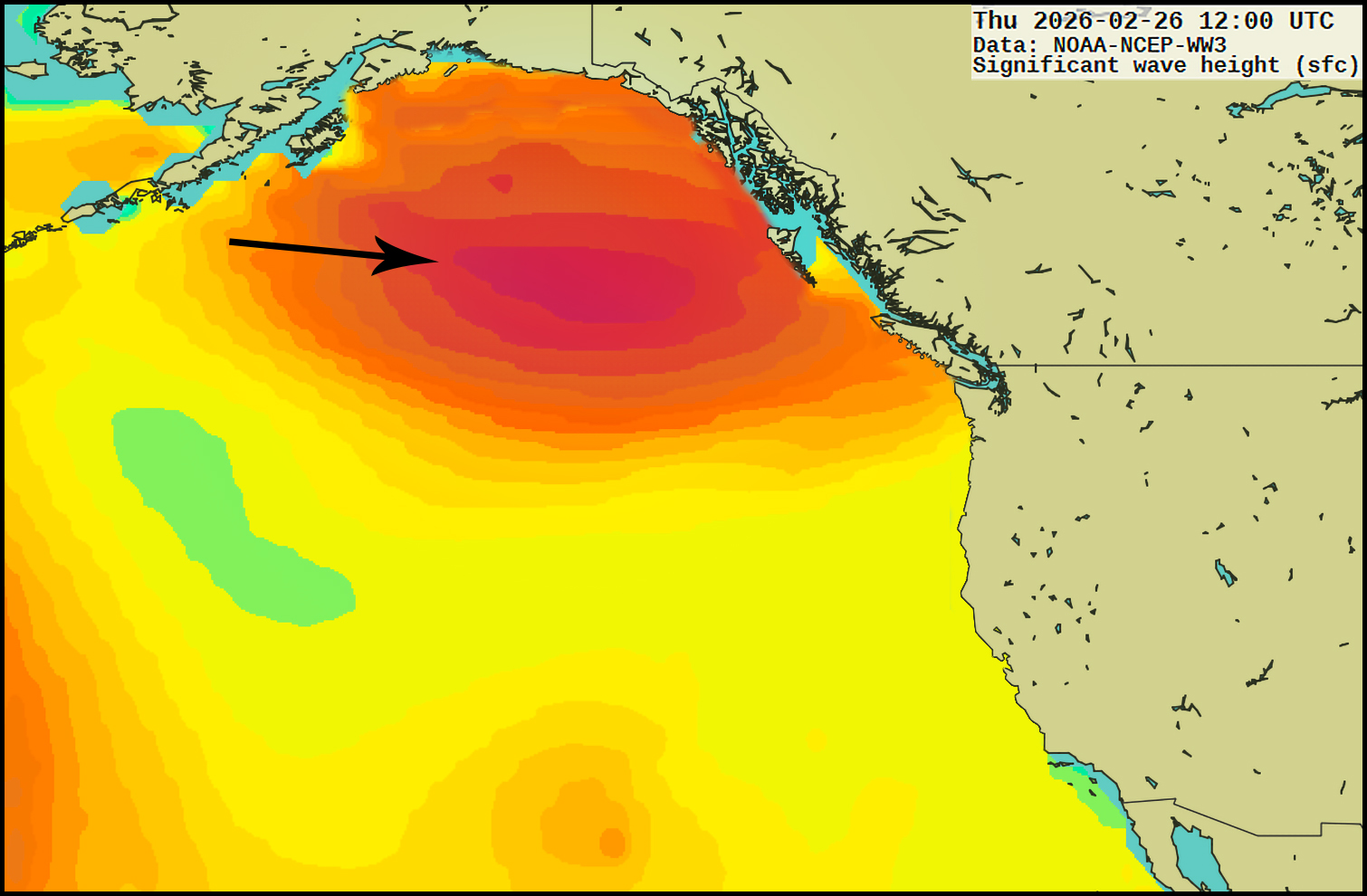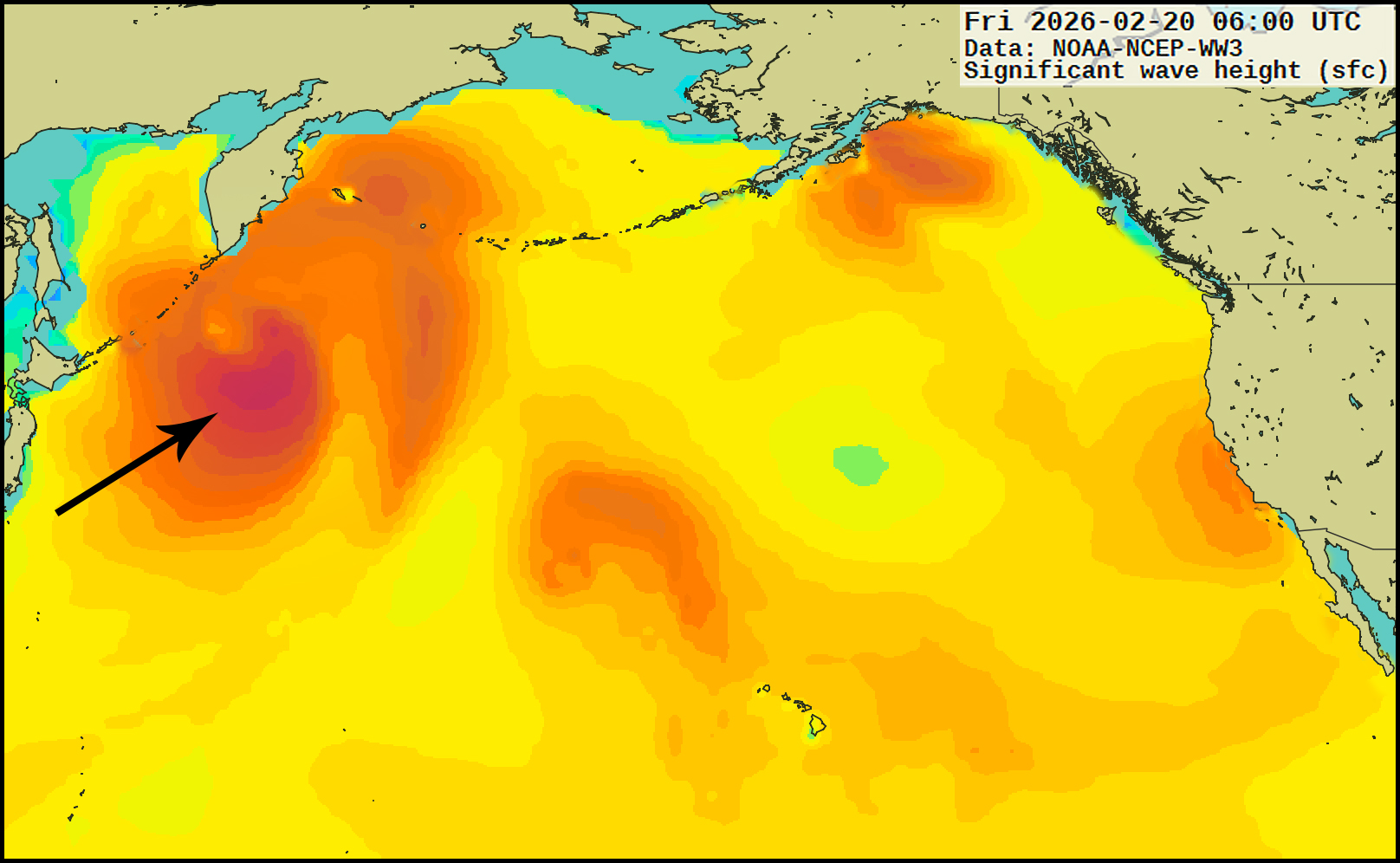 Thursday the 26th (building day) into Friday the 27th will likely see light to moderate, yet inconsistent NW ground swell from this distant, WestPac system (model generated by XyGrib from NFCENS data):