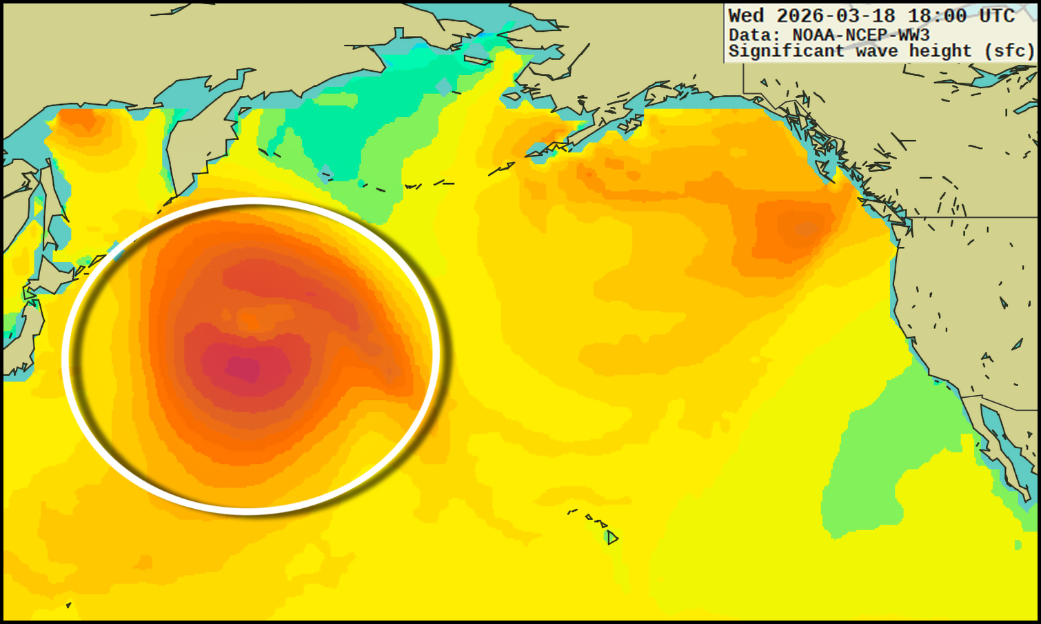 That swell is at its peak today and should fade to chest+ at south facing breaks Friday the 13th, and then waist to chest Saturday the 14th. Meanwhile, west facing breaks are seeing some wrap from the southern hemi, along with ever-present, seasonal wind swell, and intermittent ground swell from this storm that broke off Japan late last week (model generated by XyGrib from NFCENS data):