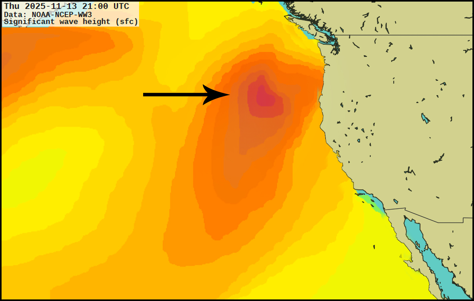 That should produce sets running head high to slightly overhead at west facing breaks late Friday the 14th into early AM Saturday the 15th, angled from 315° and periods 13-14 seconds. At the same time though, we'll likely see some wind swell in the mix as WSW winds get kicked up Thursday into Friday. Ground swell looks dominant for size, but wind swell (and strong winds) would make for less than favorable conditions.