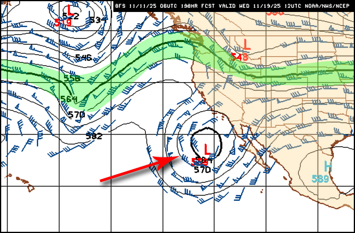 That's just one of a few cut-off lows on the models this morning that would also affect SoCal weather. But since these types of low pressure systems lack jetstream guidance, they're much harder to predict more than a couple days out.