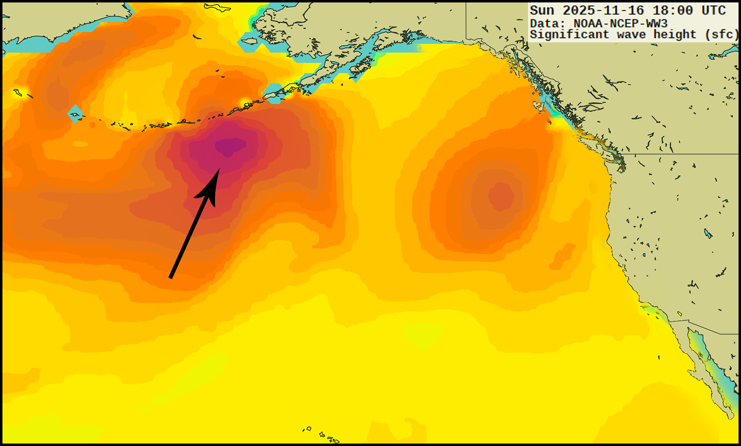 Friday the 14th remains on track for that multi-part swell, but with conditions highly questionable as a storm affects SoCal. I'll break down that storm in the Weather section below. As for swell, the first of four swells Friday will be from this system near the Aleutians (model from NOAA OPC):
