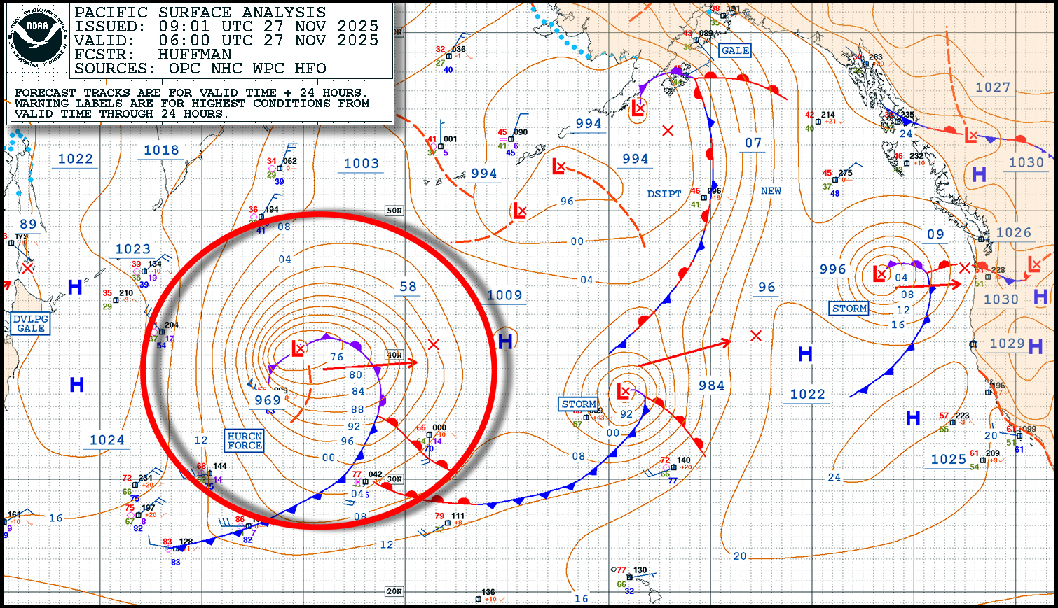 That system didn't last long, quickly fading once passing that position. Its distance should result in less consistent swell with notable lulls between sets. ETA for the main band of swell is around midmorning today. When this swell peaks, size should run a couple feet overhead at west facing breaks, angled from 290° and periods 18 seconds. However, a problem we're facing today and the next couple days is a radically deep high tide early in the morning, which could shut down (or slow down) many spots, especially the reefs and points. Tidal depth, and subsequent conditions, will change dramatically hour by hour.