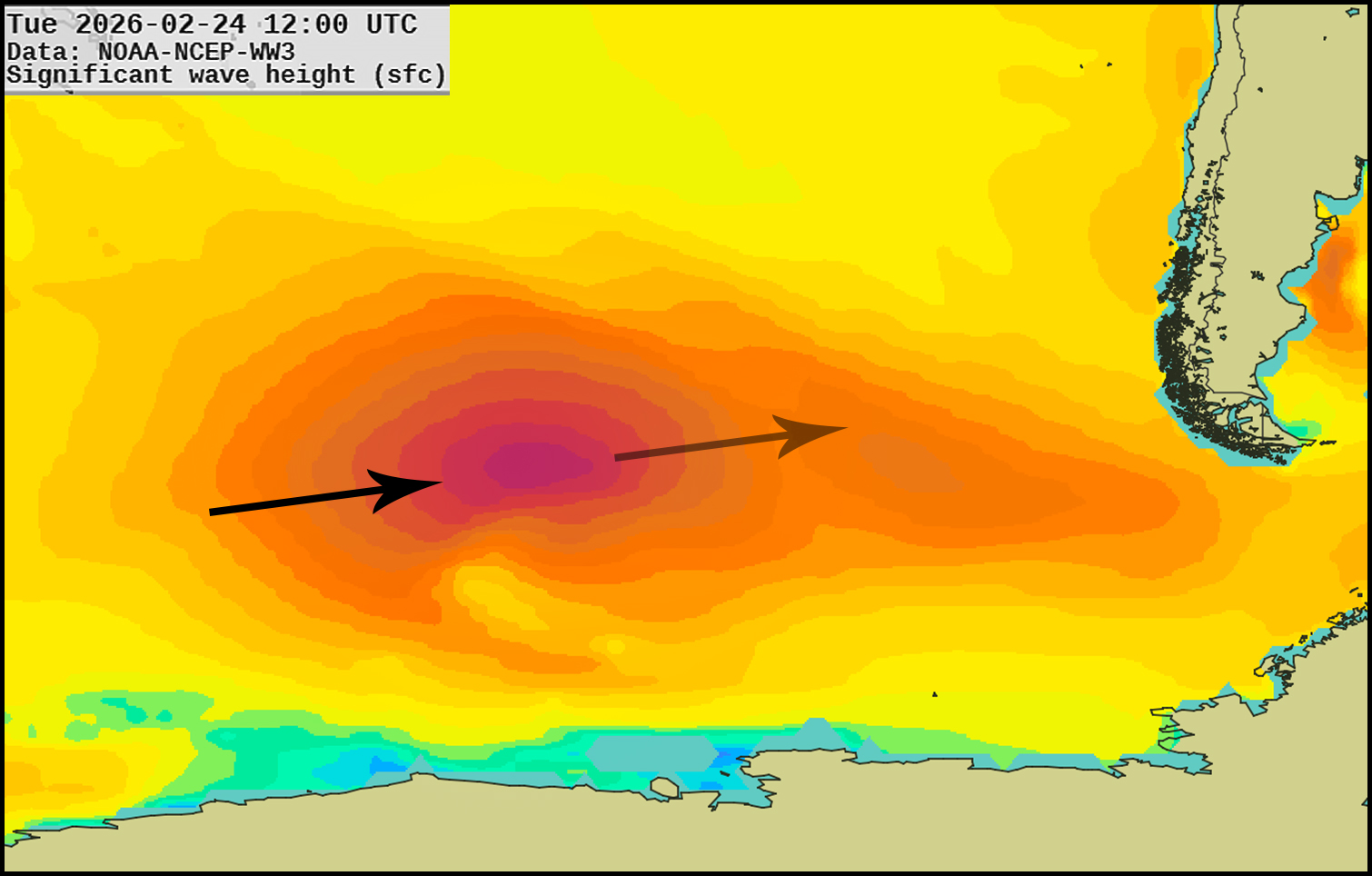 The next swell on my notes this morning is a potential southern hemi for Thursday March 5th from this low latitude system near Antarctica (model generated by XyGrib from NFCENS data):