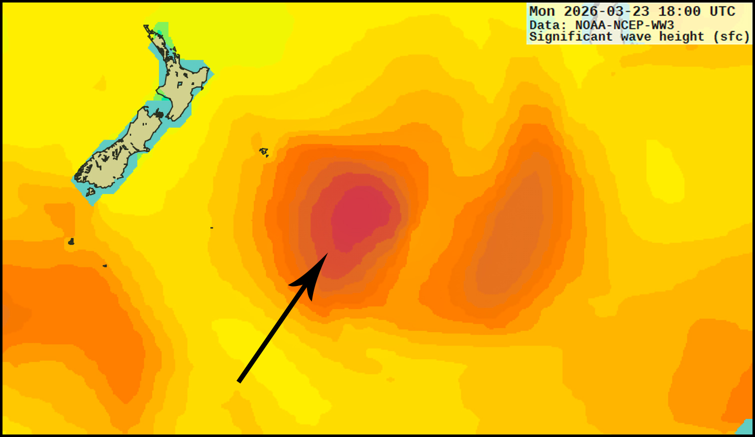 Sunday the 15th (building day) into Monday the 16th (peak) should see the next southern hemi ground swell from this system that grew near New Zealand and eventually took an ideal turn to the northeast as it traveled east (model generated by XyGrib from NFCENS data):