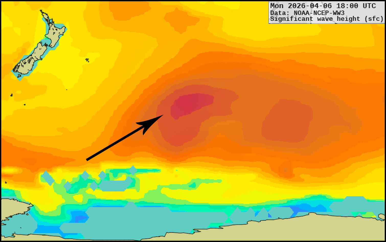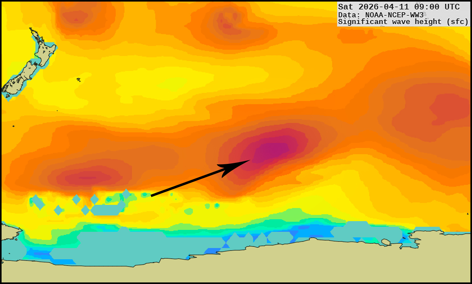 Tuesday the 14th is the next swell on my charts this morning, which could be the first in a series of southern hemi ground swells including this one that'd drift north off Antarctica near New Zealand (model generated by XyGrib from NFCENS data):