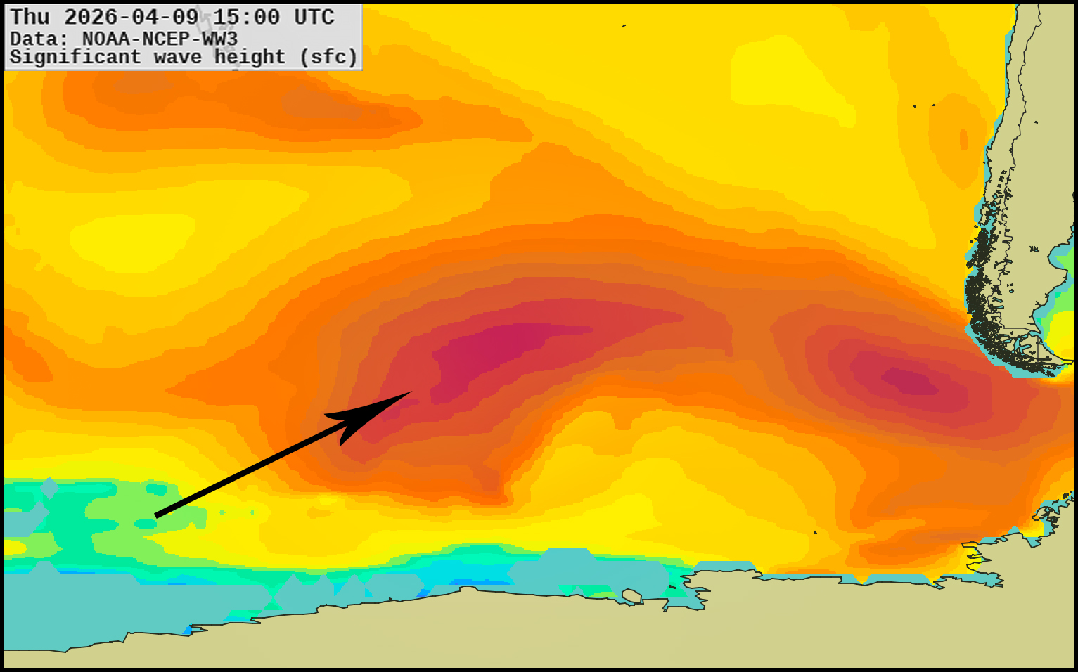 A system prior to that should peak in 48 hours, resulting in initially waist to chest high waves at south facing breaks Tuesday the 14th, angled from 205° with periods 16 seconds. And then, that swell above would keep size closer to chest high at south facing breaks Wednesday the 15th and Thursday the 16th, angled similarly from 205° with periods 15 seconds. That particular swell would linger Friday the 17th before getting a boost in size from this system closer to Chile on the 7-day models (model generated by XyGrib from NFCENS data):