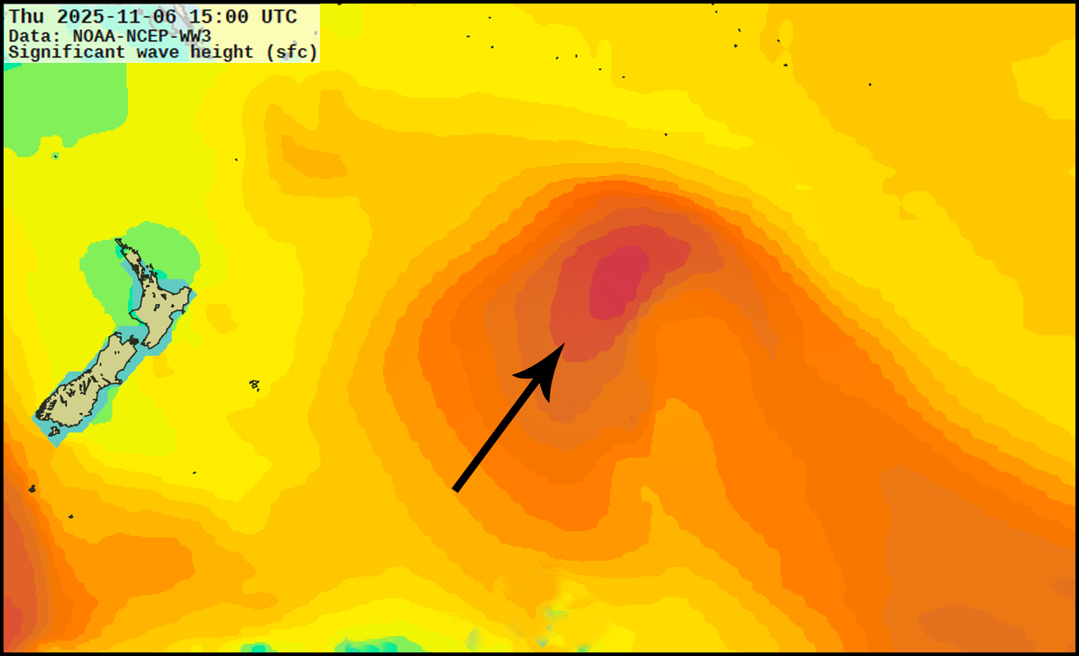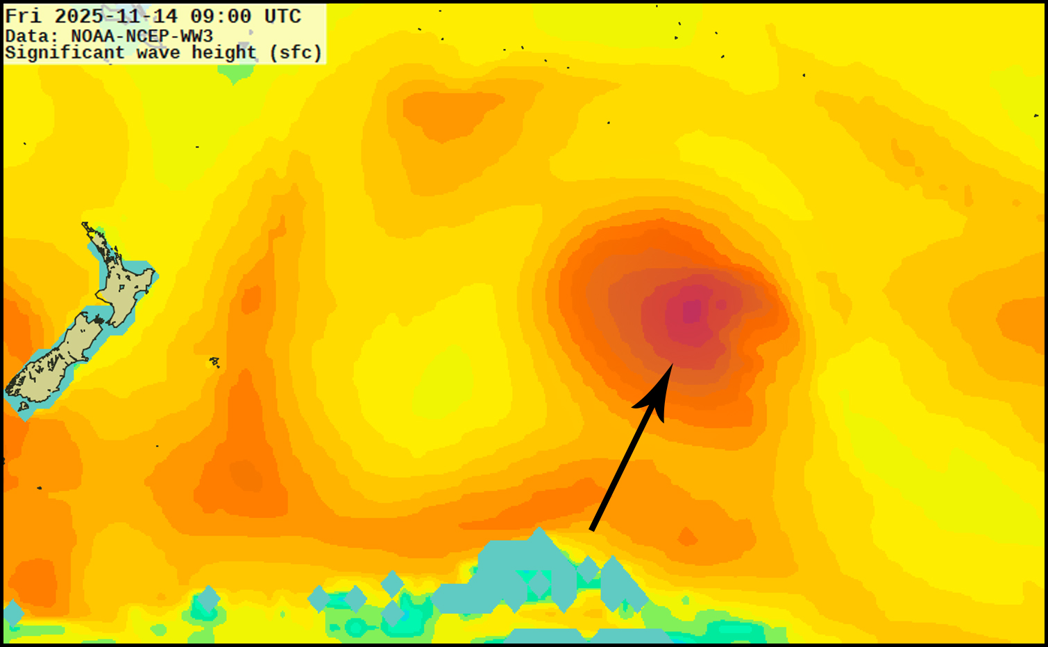 Along with all of this NW swell, Friday the 14th should also see SW ground swell from this system that formed east of New Zealand last week (model generated by XyGrib from NFCENS data):