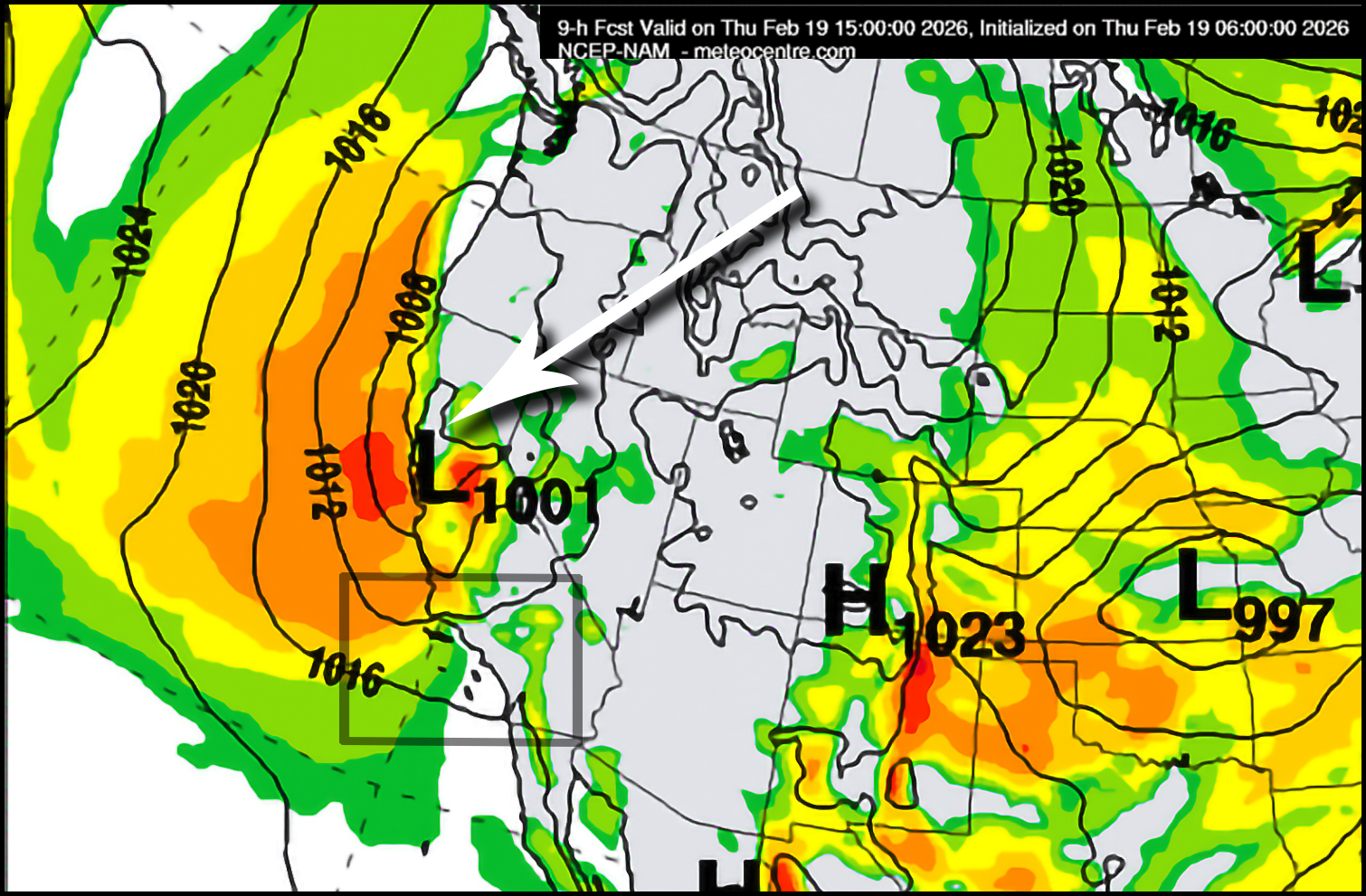 Today (Thursday the 19th) the recent round of storm-driven swell is backing down temporarily. That will change later today into tonight as this area of low pressure is cranking up winds off NorCal (model by UQAM):