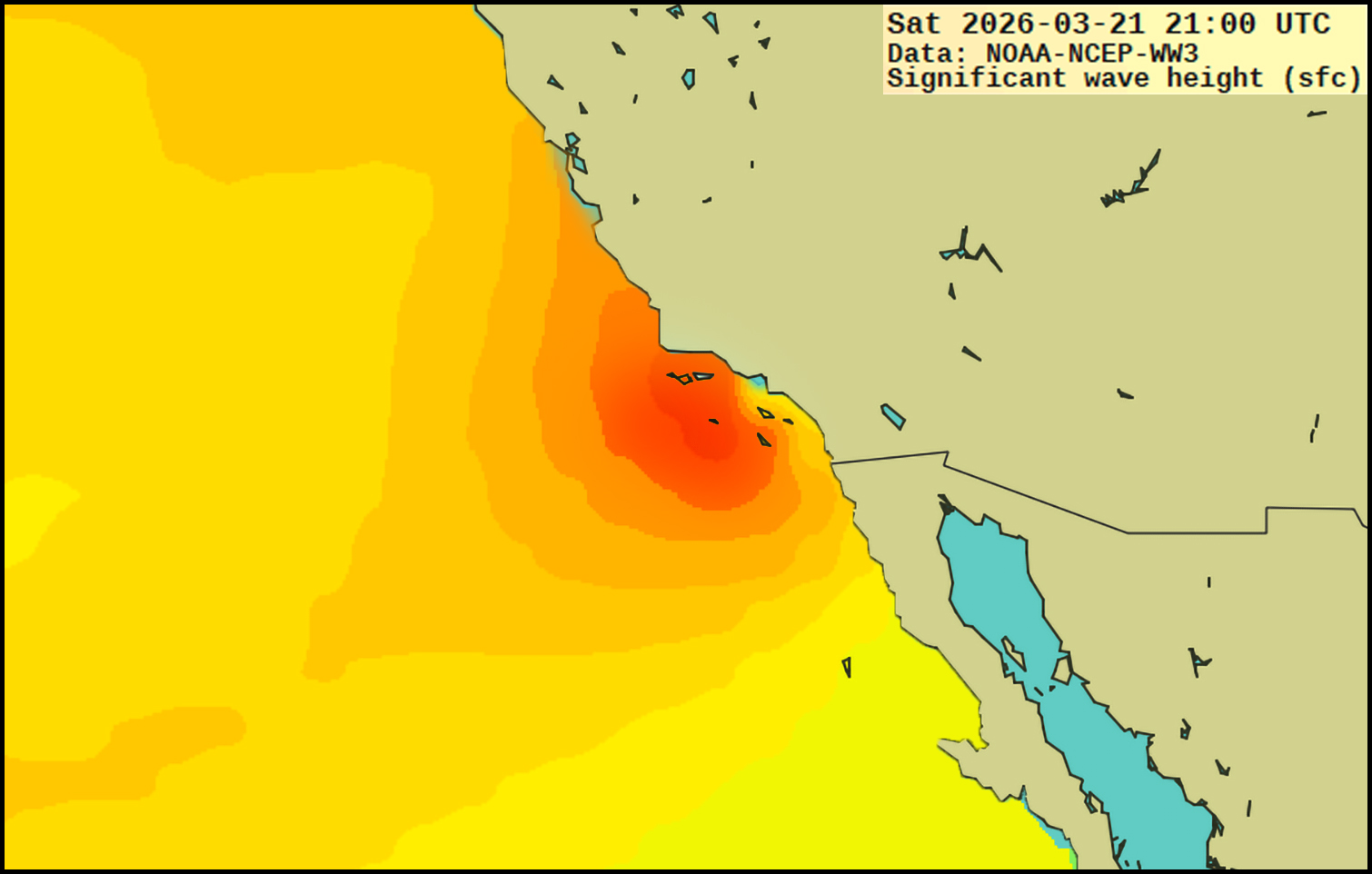 That should produce sets running waist to chest high at south facing breaks by Saturday the 21st, angled from 205° with periods 15-16 seconds. However, it may go unnoticed as we could see strong NW wind swell Saturday the 21st from winds off the coast that could produce this robust fetch of 18' seas near the Channel Islands (model generated by XyGrib from NFCENS data):