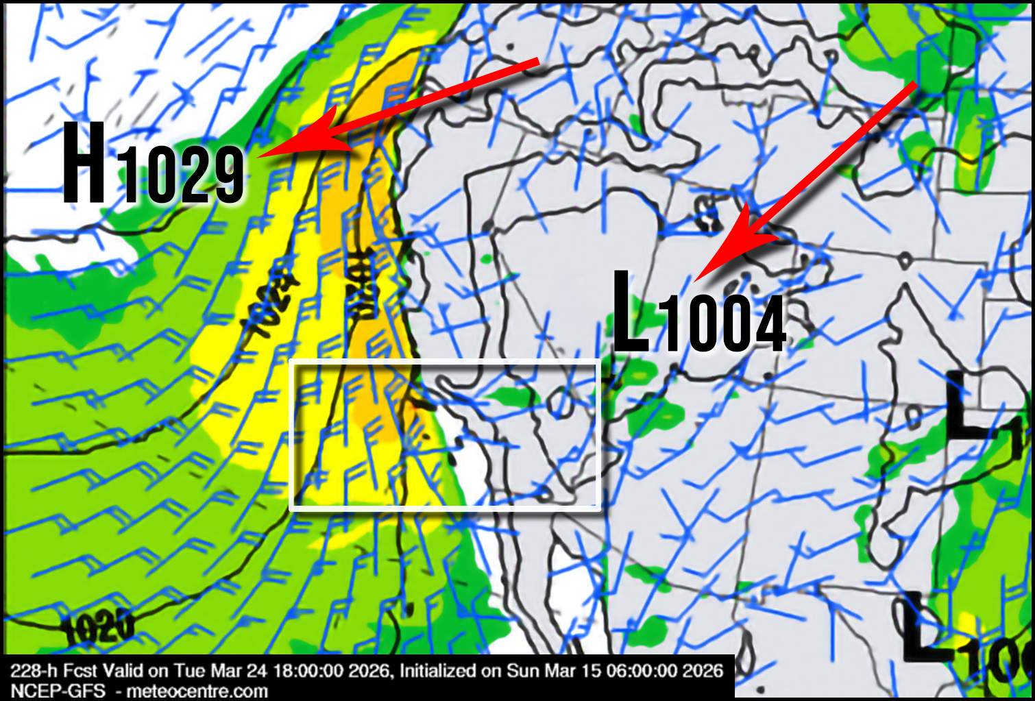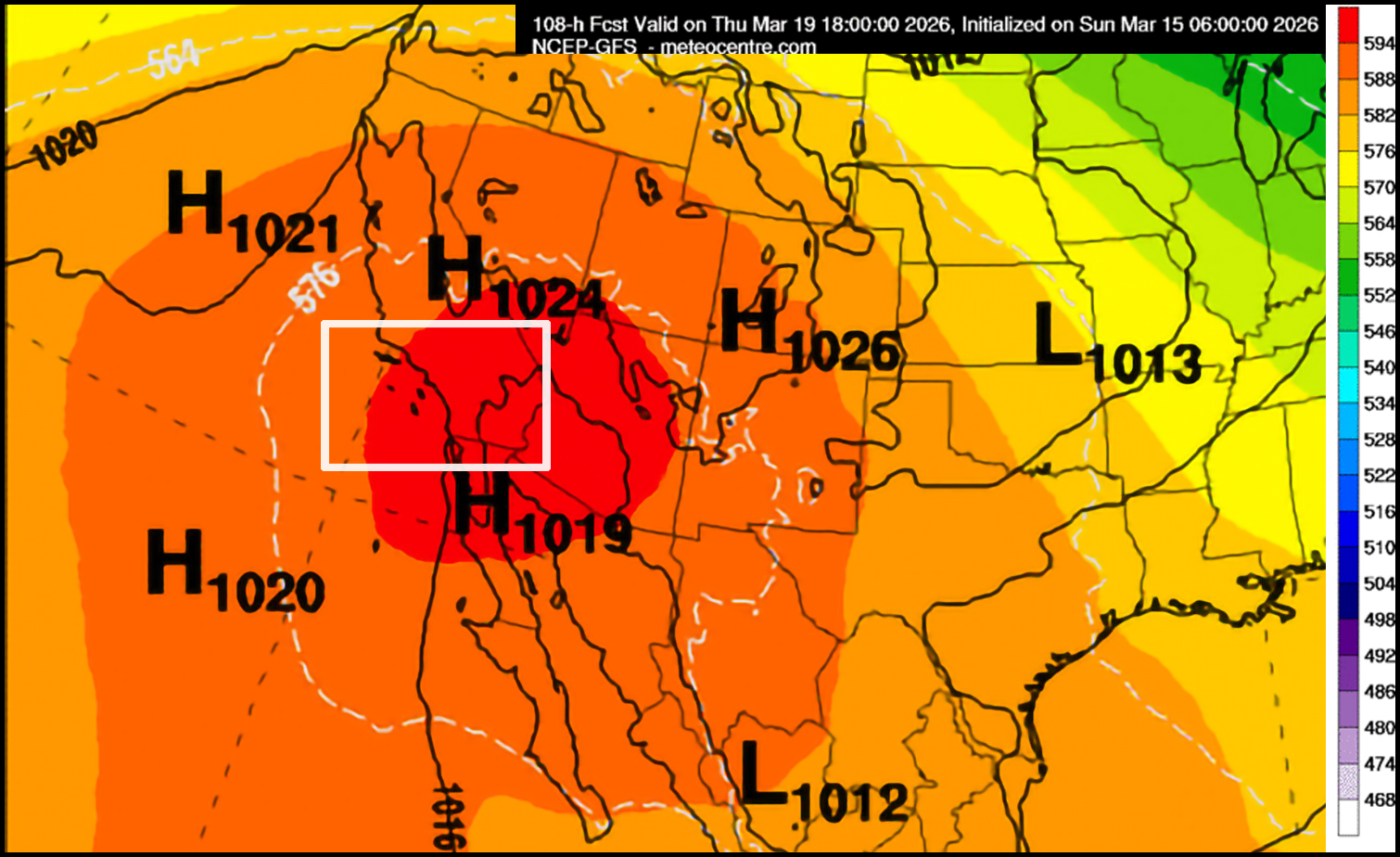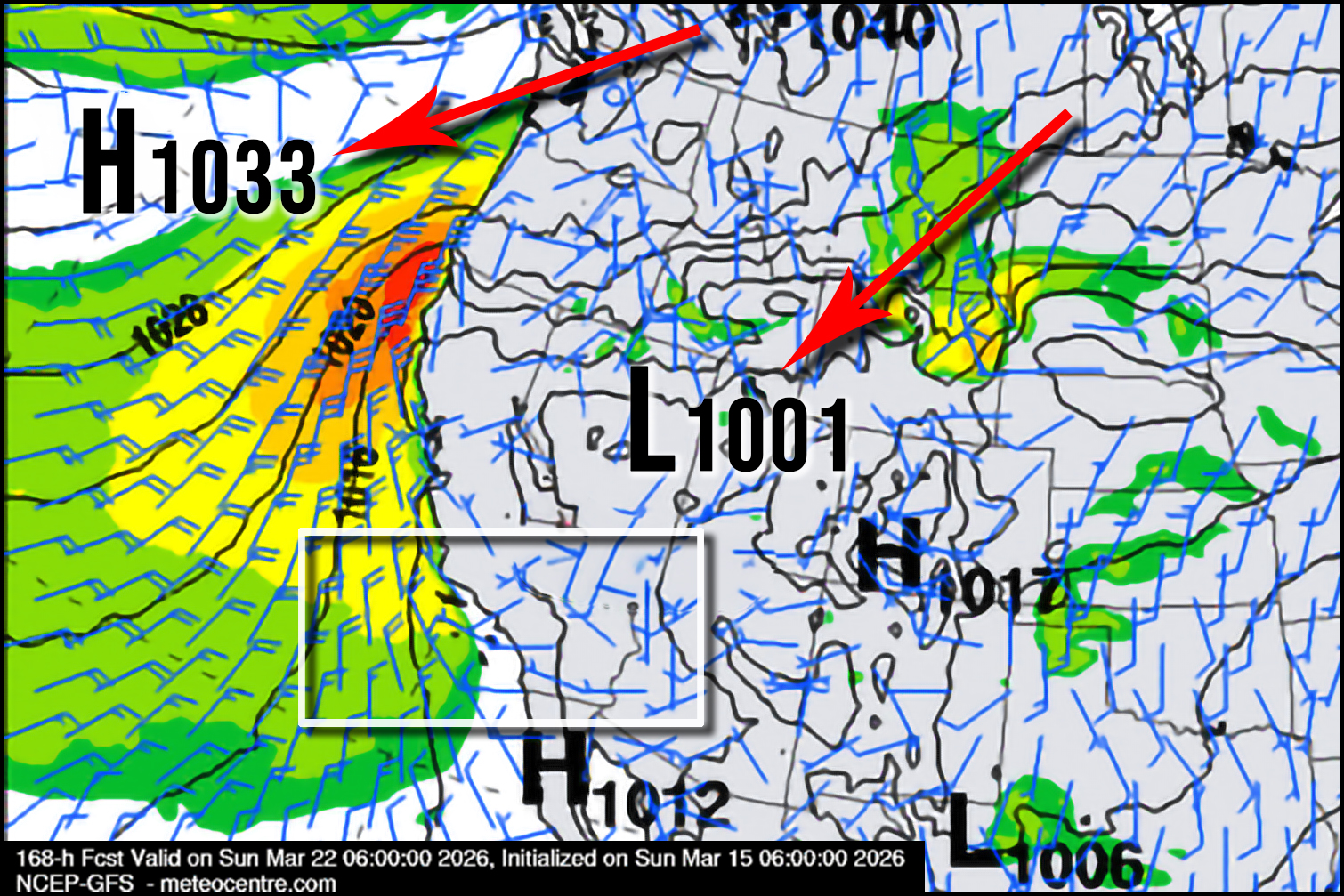 Today (Thursday the 12th) a very strong, 1033mb surface high pressure system is covering most of California, aligning with a fairly strong 590dm upper-level high over SoCal. This is drawing a warm air mass north from Mexico/Baja, making for round 1 of an inland heatwave for SoCal. At the coast, this should keep skies clear with warm temps today and Friday the 13th.