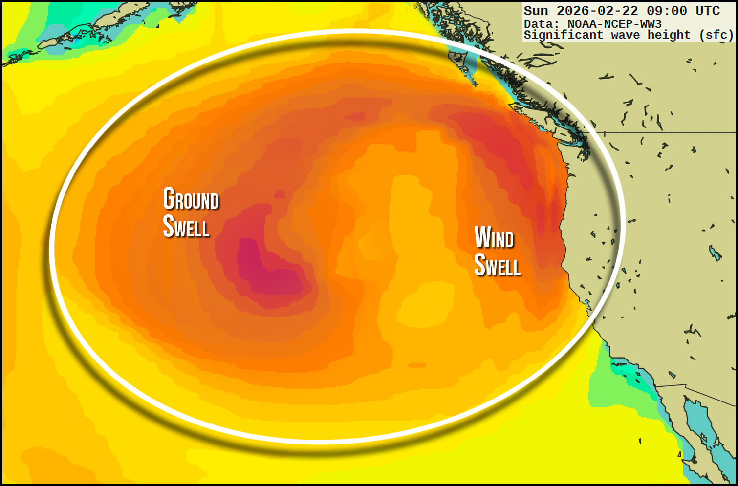 Monday the 23rd will likely see NW wind swell build ahead of NW ground swell from this swirling mass of fetch brought on by a large trough of low pressure in the Gulf of Alaska (model generated by XyGrib from NFCENS data):