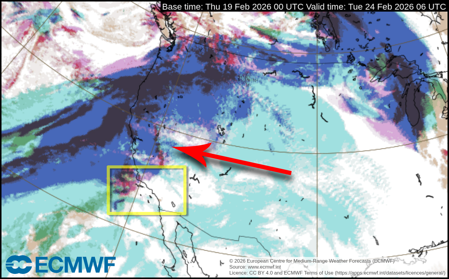 Friday the 20th should be dry. A weak offshore flow sets up over the weekend so Saturday the 21st and Sunday the 22nd look dry as well. In fact, models show a tad more offshore push Monday the 23rd as models now keep SoCal dry next week, but with a few question marks. Models this morning have departed from the earlier idea of rain early next week with many now showing just enough high pressure to keep rain to the north of SoCal. We can see how close it'd get on this cloud-cover model (model from ECMWF):