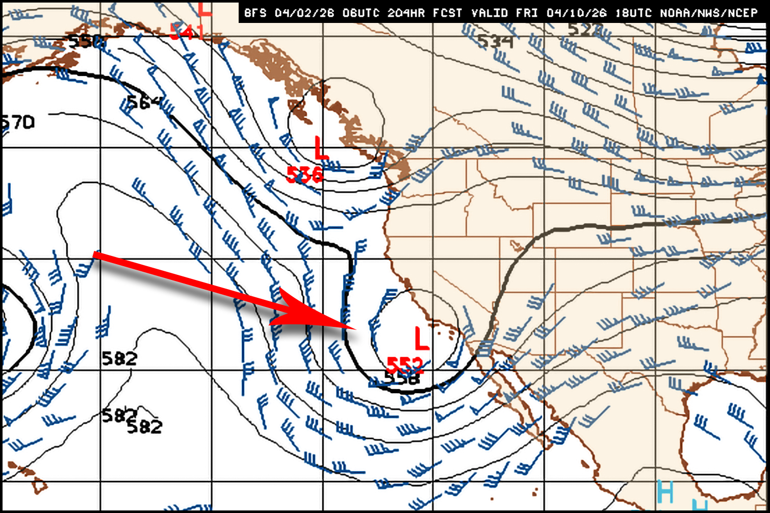Monday the 6th sees the high break down for a cooling trend as this area of low pressure approaches the coast, which could eventually pass through SoCal during the second half of the week (model by NOAA MAG):
