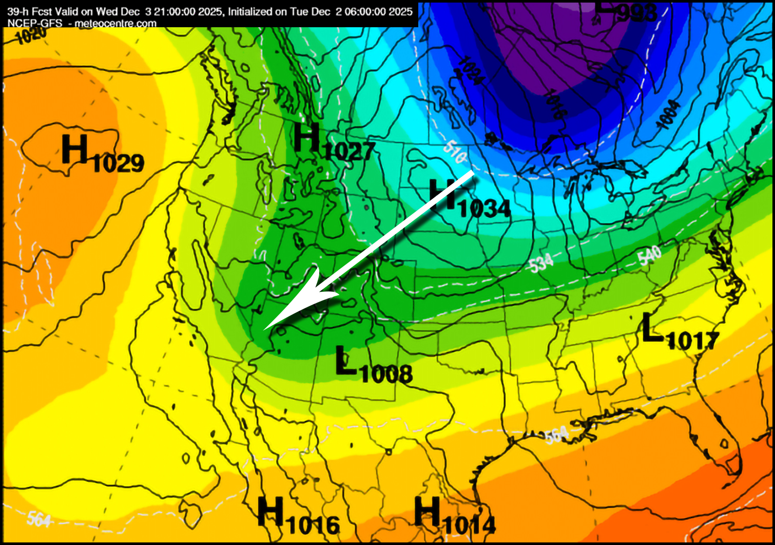 Wednesday the 3rd sees a trough of low pressure push south, which will affect weather and winds Wednesday and Thursday. Here's a look at this trough (shades of green) when it dives to its lowest point Wednesday afternoon (model by UQAM):