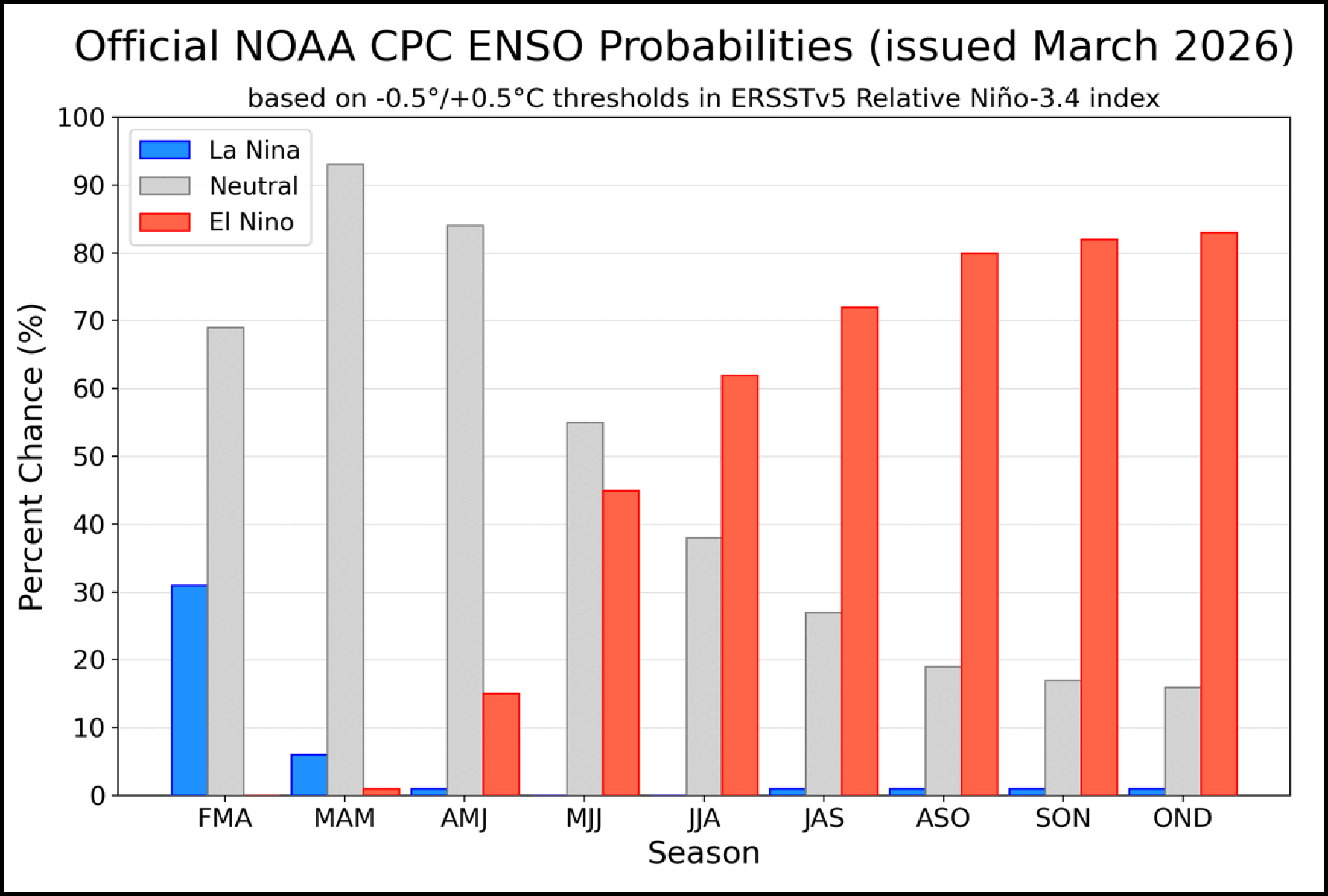 We're approaching the second bar of March, April, May (MAM) when neutral-Niño should be dominant, saying goodbye to La Niña. And by summer we should be officially in El Niño, even more so by the winter of 2026-27.This would make for an active summer, fall and winter for SoCal surf (more on that here). As for how strong this approaching El Niño would be, the highest likelihood right now (80%) is for a moderate Niño with anomalous SSTs measuring 0.5°C. As you may know, the strongest Niños I talk about in Surf, Flood, Fire & Mud were higher, but when the strength is closer to a neutral-Niño then things can be exceptionally active for waves and weather.