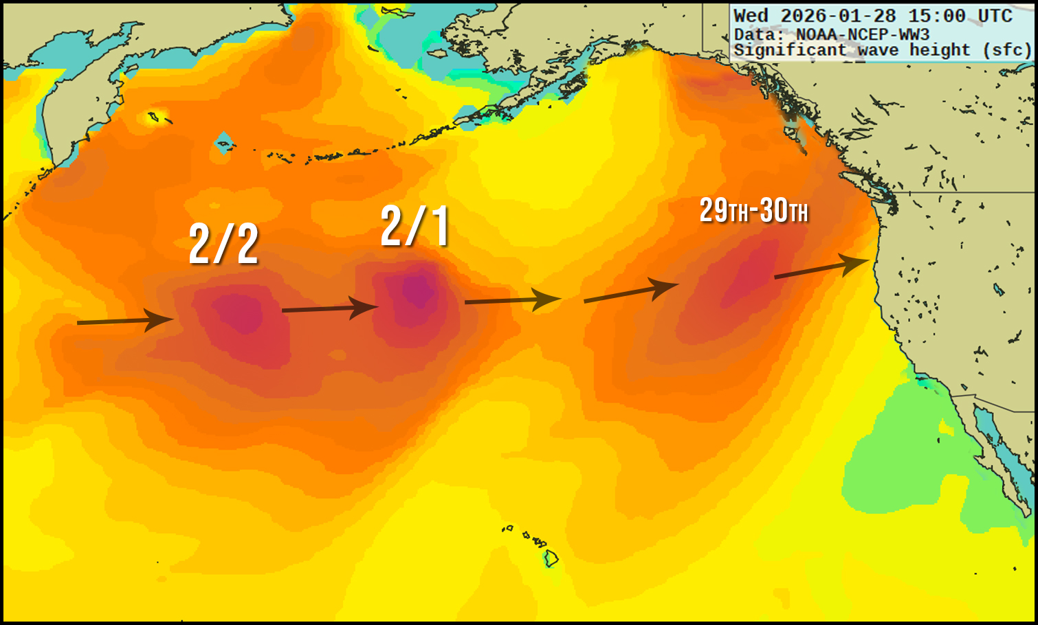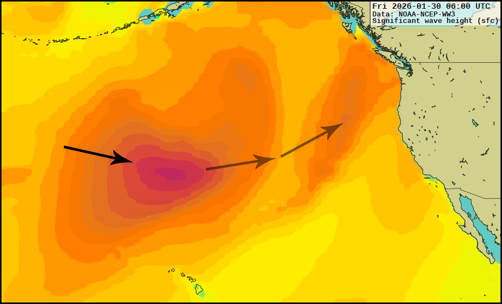 I popped in arrows to show the jetstream's course and noted the remnant fetch for the swell this Thursday into Friday. But the main points of interest are the systems farther west, poised to cross our ideal swell window across the Aleutian-Hawaiian longitude. But while NW ground swell will be sent our way once those systems peak tomorrow, the second system is expected to take a temporary, lower latitude course, directing even more of its swell to SoCal (model generated by XyGrib from NFCENS data):