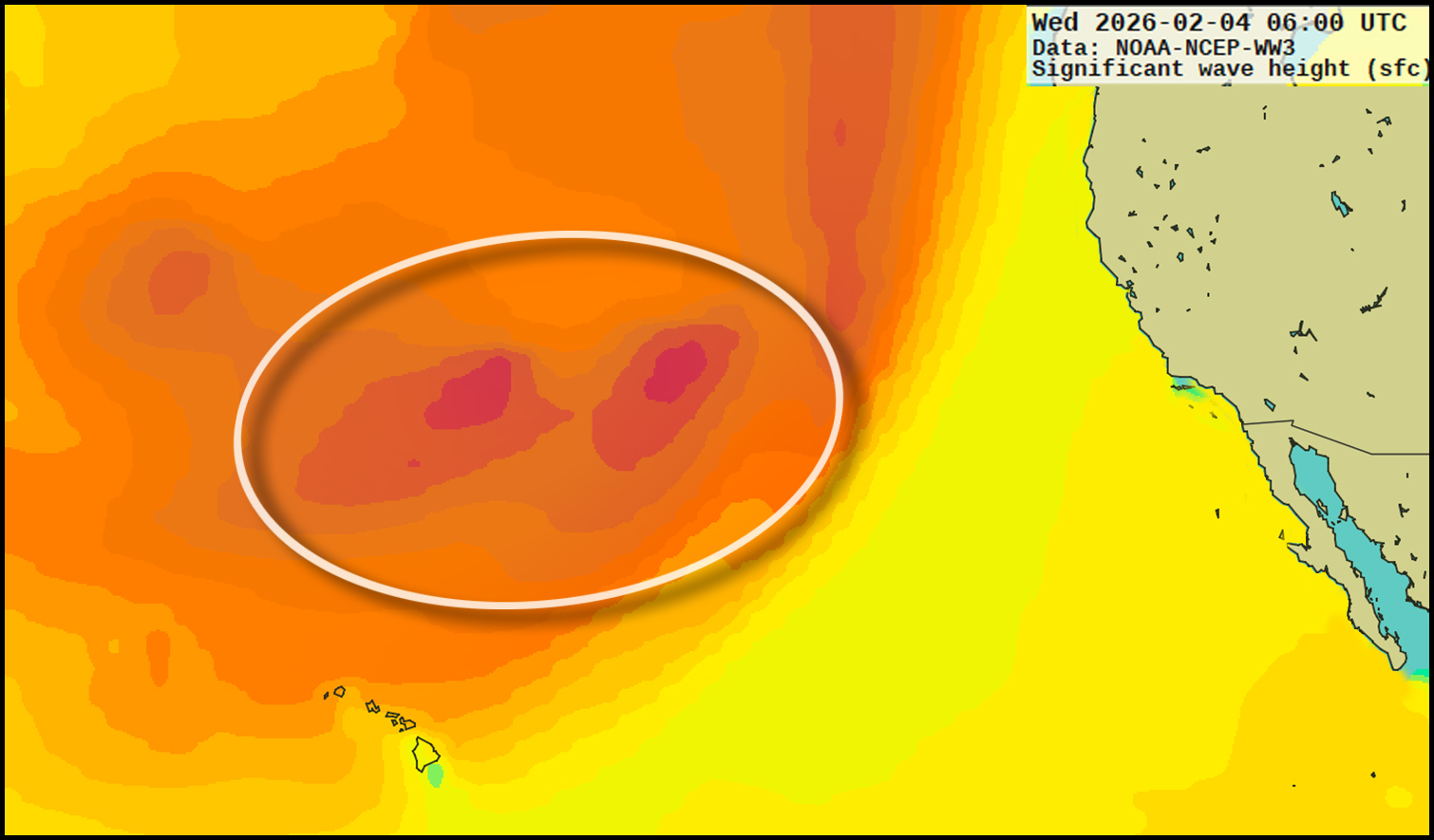 Thursday the 29th (building day) into Friday the 30th (peak) should see the first NW ground swell from this system, growing into a hefty fetch of 25-30' seas right before turning north (model generated by XyGrib from NFCENS data):