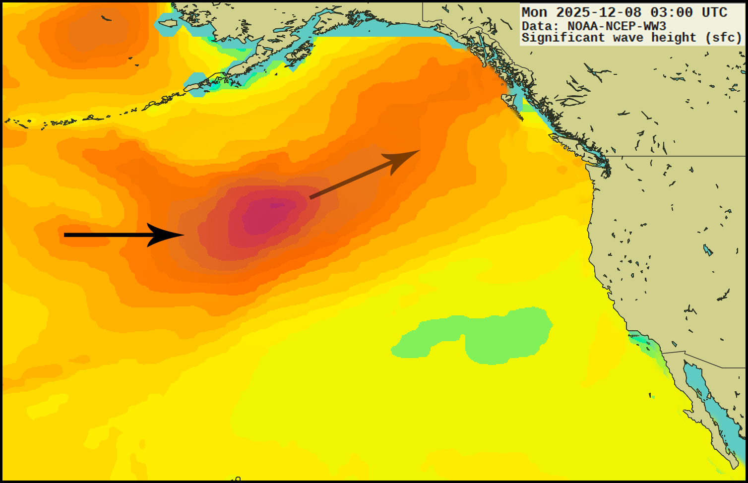 With 30' seas from that position, west facing breaks would see head high sets Thursday the 11th, angled from 300° with periods 16 seconds. This is still out on the long range so it needs more monitoring.