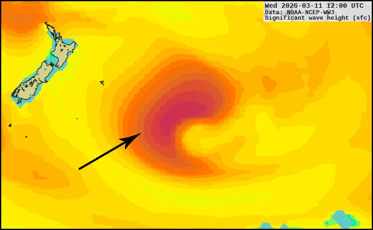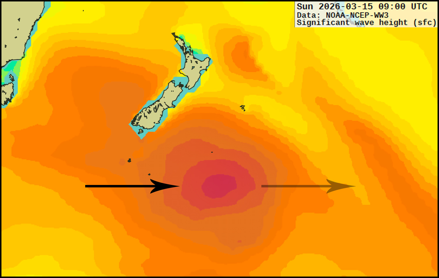 Sunday the 15th (building day) into Monday the 16th (peak) should see the next southern hemi ground swell from this system that grew near New Zealand and eventually took an ideal turn to the northeast as it traveled east (model generated by XyGrib from NFCENS data):